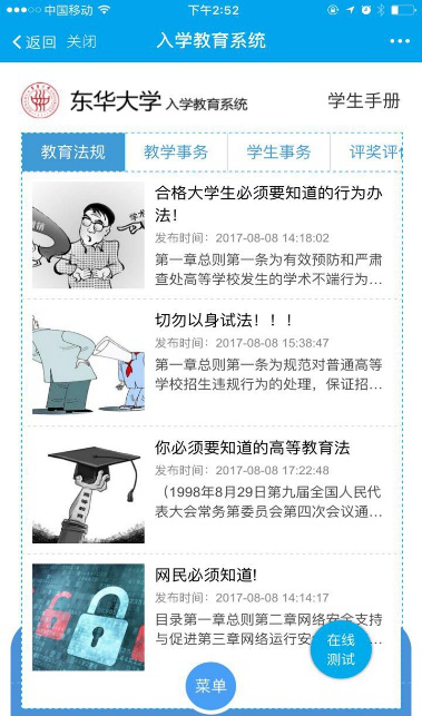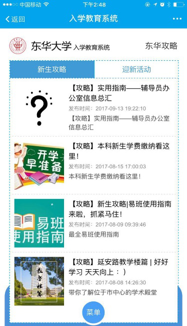 “易”路同行,一路真情相伴。暑假期间,我校58名专兼职新生辅导员全部进驻易班为新生答疑解惑,东华易班机构号为新生们量身定做了10个迎新“大礼包”精品帖,报到流程、各学院入学教育日程表、家长会查询、校园一卡通使用视频等一应俱全,发布至今,累计浏览量10万多人次。